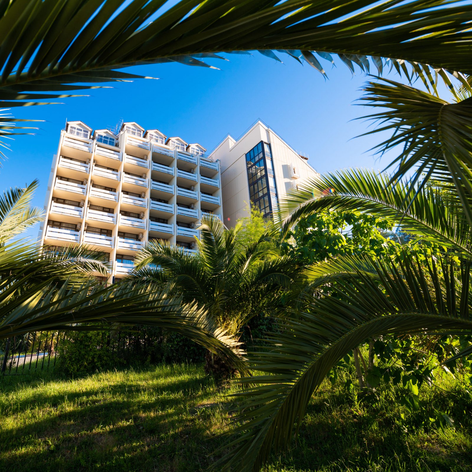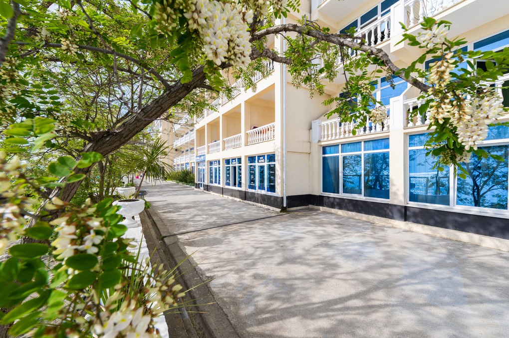 Территория спа-отеля охватила 16 га, где пролегают тенистые аллеи, растут экзотические деревья и цветущие клумбы, оборудована парковая зона для отдыха и досуга и собственная пляжная линия. Пляж с песком и мелкой галькой расположен в 20 метрах от 7 корпуса. На побережье оборудованы кабинки для переодевания, шезлонги и навесы от солнца, бар с прохладительными напитками.